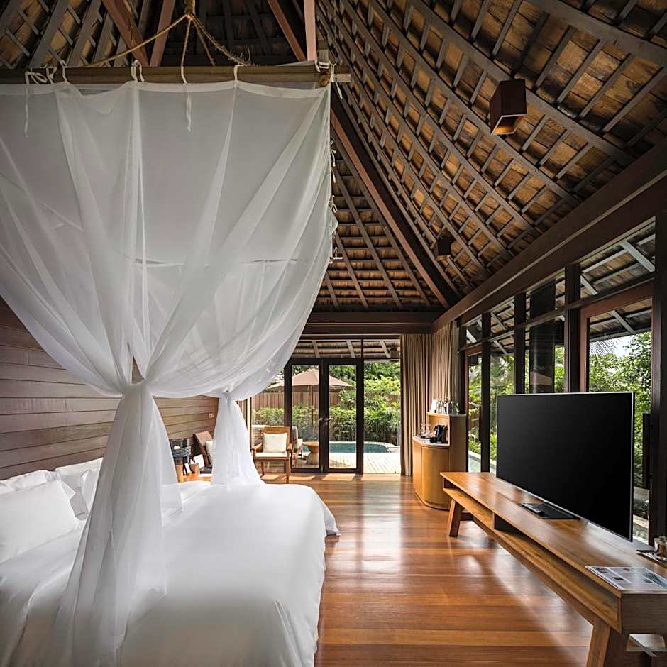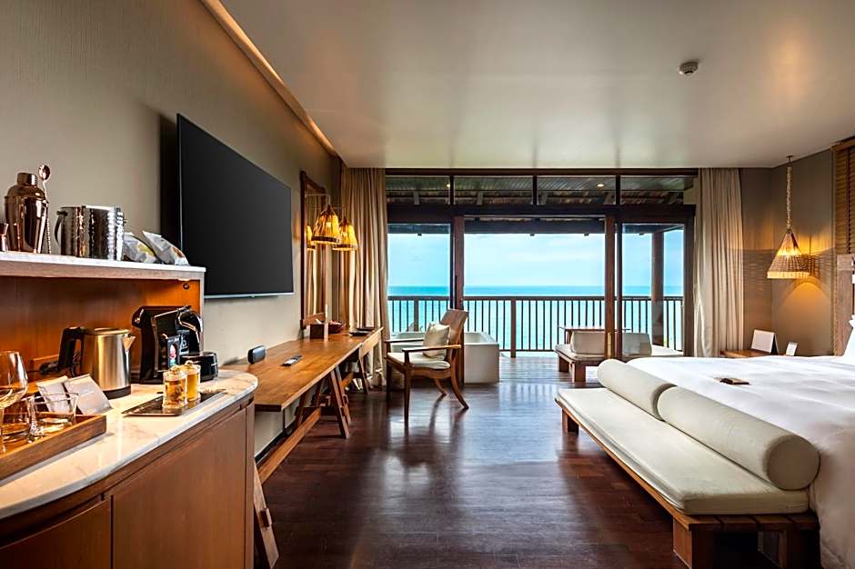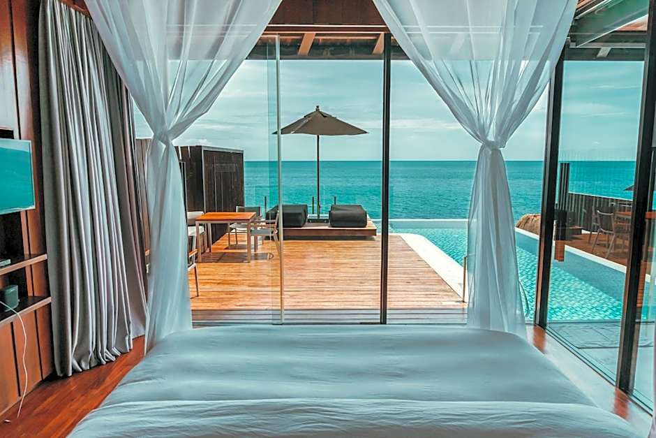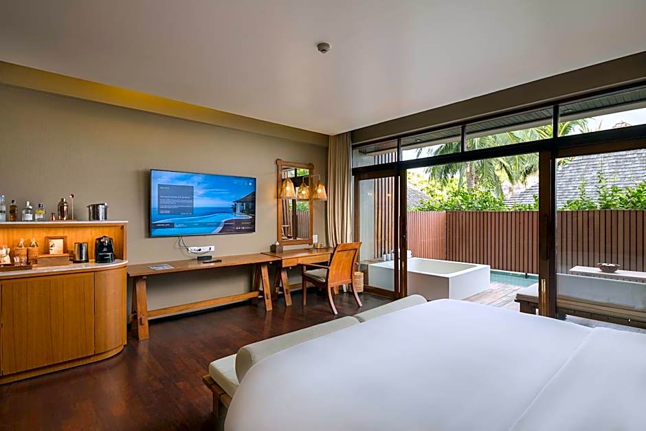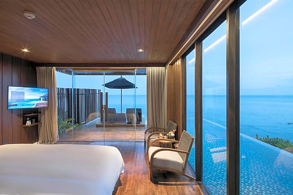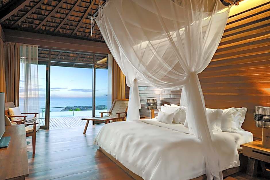 Ocean front villa features an infinity-edged private pool, private terrace and dining area. It comes with a TV, DVD player and tea/coffee making facilities. An private bathroom is fitted with a separate shower and terrazzo bathtub. Guests can enjoy direct access to the pool from the bathroom.